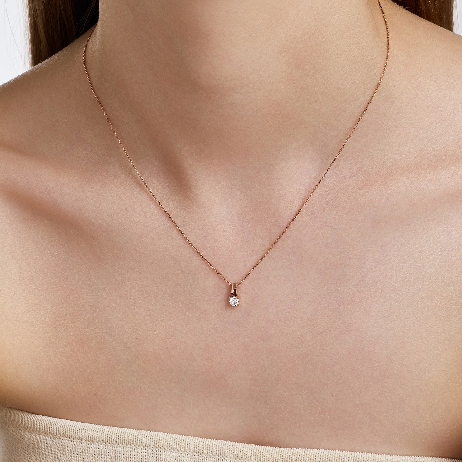 This rose gold necklace highlights the timeless brilliance of a white lab-grown diamond, elegantly set to capture and reflect light with every movement. The warm tone of rose gold enhances the diamond’s radiance, creating a harmonious balance between modern sophistication and classic charm. A refined piece that embodies understated luxury for everyday elegance.