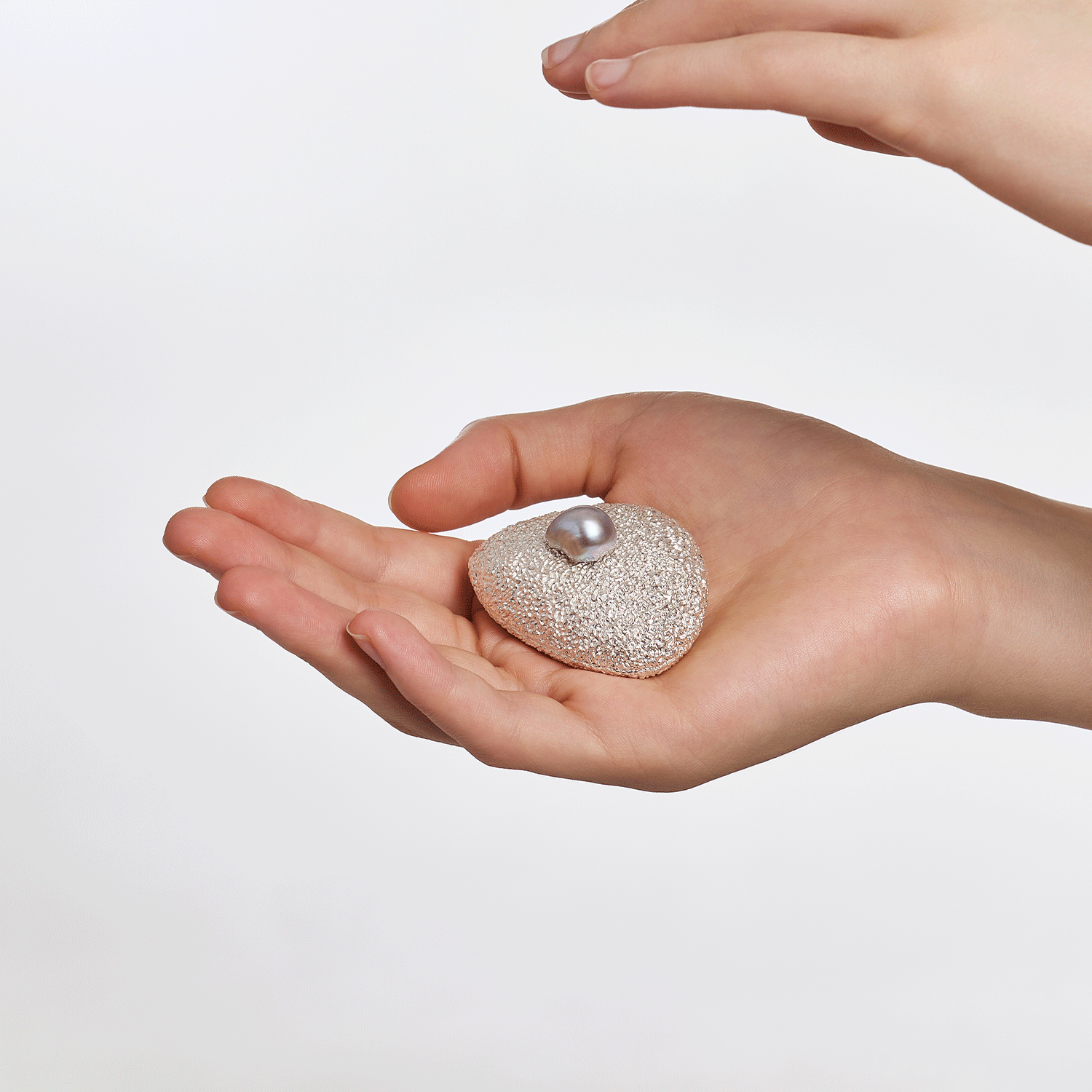 Inspired by the freshness of morning dew resting on green leaves, this silver objet captures both beauty and function in a poetic form. Its organic, unrefined texture reflects the purity of nature, while the soft luster of the pearl accent evokes the serenity of dawn. Designed to hold cherished small items, this case transforms everyday moments into an artful experience.