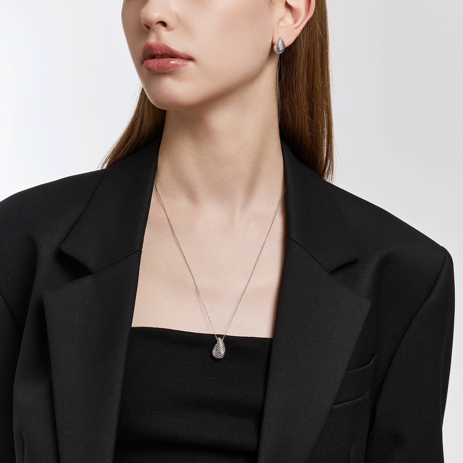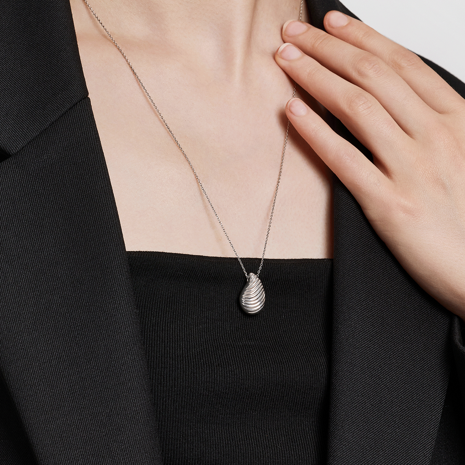Inspired by the serene beauty of falling raindrops, this silver necklace captures the fluid motion and gentle curves of water. The pendant’s soft, wave-like texture reflects light with subtle elegance, evoking a sense of calm and natural harmony — an understated piece that brings quiet sophistication to everyday wear.