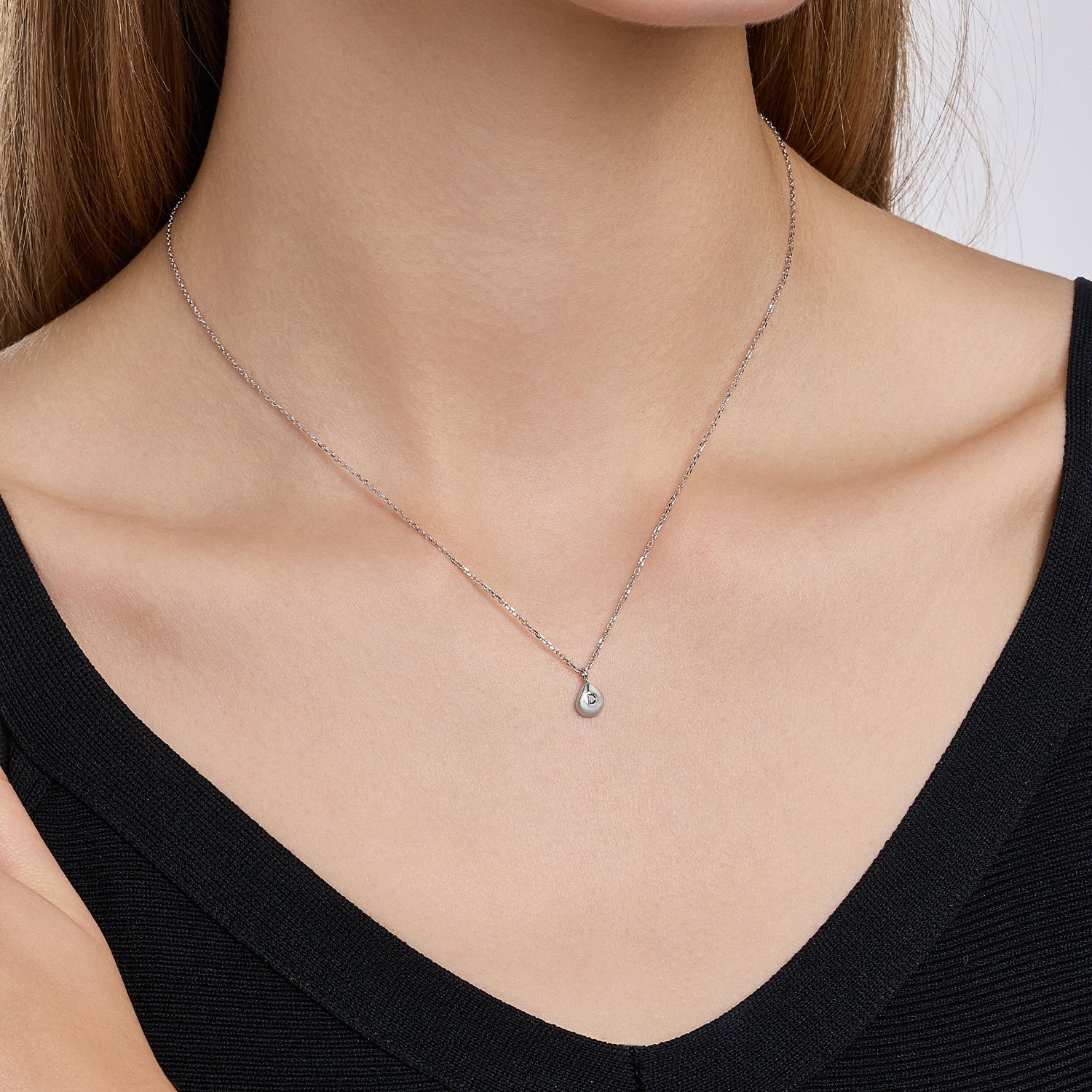 Inspired by the clear, softly shimmering soap bubbles of a fresh morning, this necklace captures a fleeting moment of lightness and purity. The gently rounded pendant, finished in white gold plating, is set with a delicate lab-grown diamond that reflects light with a quiet, floating brilliance. Suspended from a fine silver chain, the design rests lightly against the skin, adding a subtle glow to everyday moments. A refined expression of softness and clarity — because little things mean a lot.